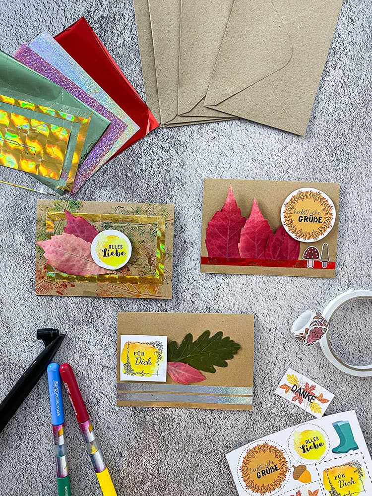 - 4x Schablonen aus Karton Herbstblätter (für die Blättergirlande)5x Karten und Umschläge aus Kraftpapier (zum Gestalten von 5 Karten)