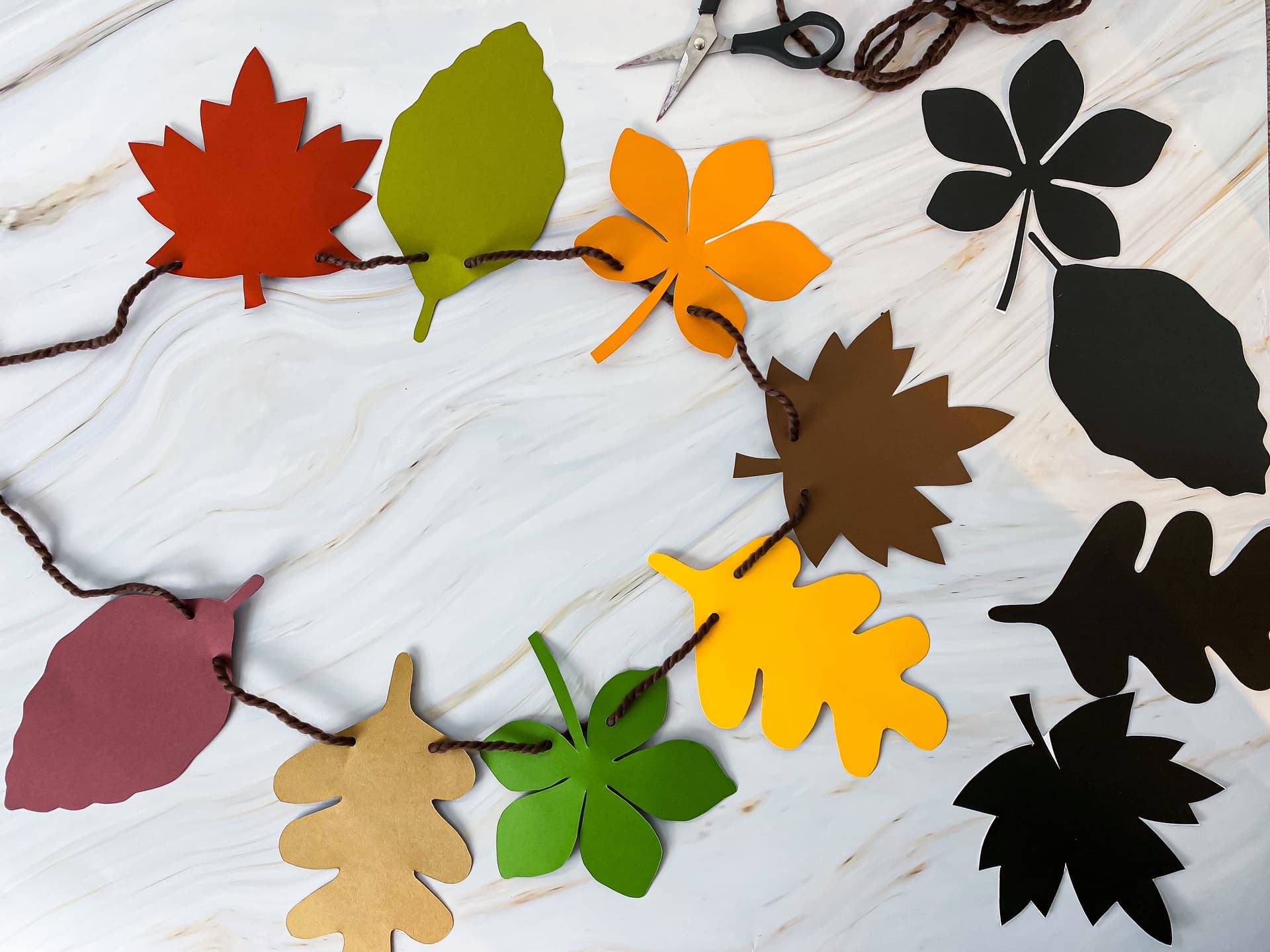 Diese Blättergirlande sieht klasse an Türen und Fenstern aus, kann aber auch einer Kinderzimmerwand ganz toll in einen herbstlichen Touch geben. Mit dem Material in der Herbstbox könnt ihr eine bis drei Girlanden machen und wahrscheinlich wird danach noch Tonpapier übrig sein.
