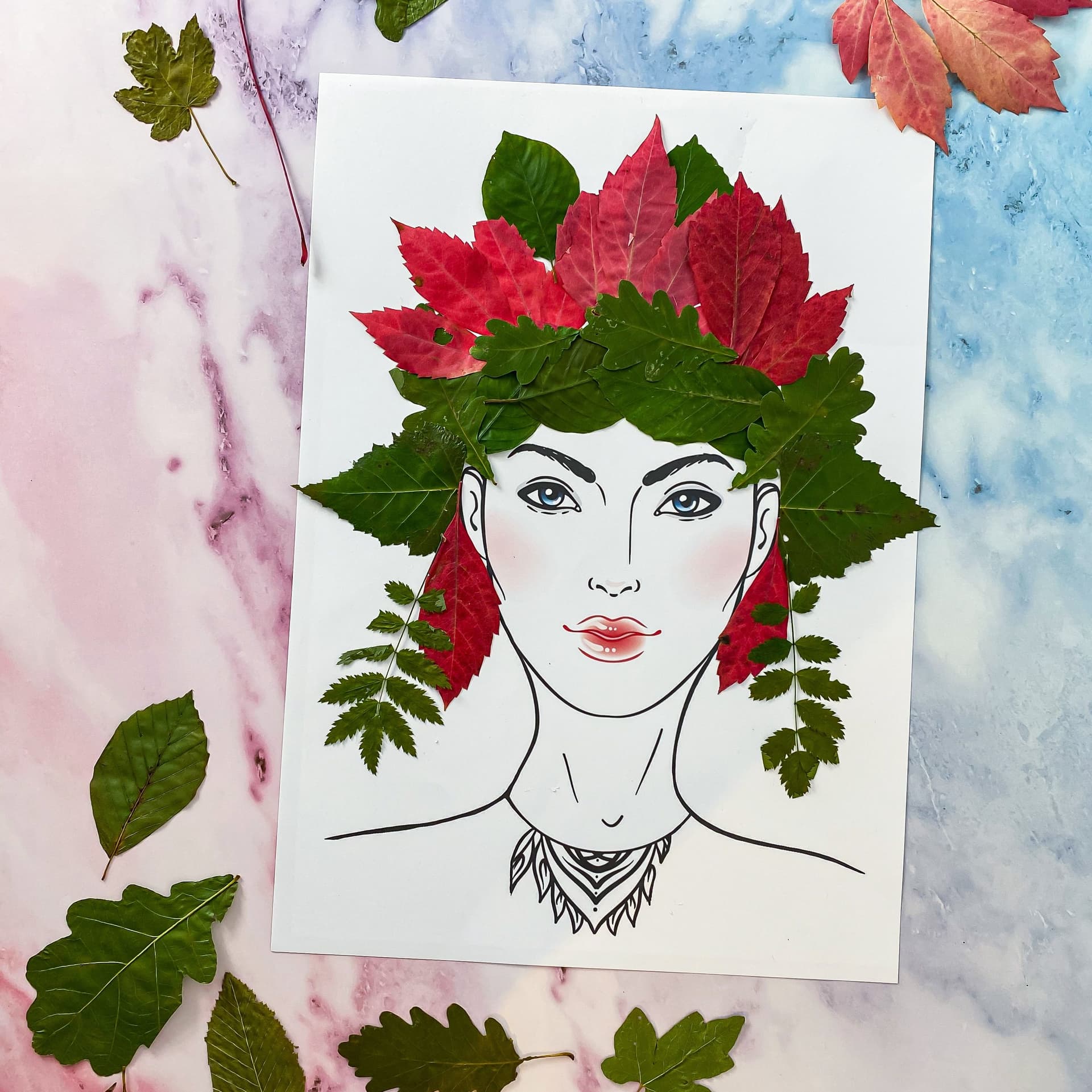 Das Poster der Herbstgöttin eignet sich super für einen langen Waldspaziergang auf dem man die schönsten Blätter sammelt. Im Anschluss werden diese gepresst und mit viel Kleber auf den Kopf der Göttin geklebt.