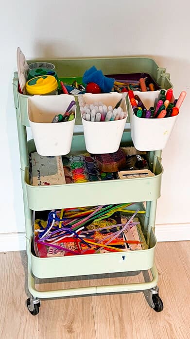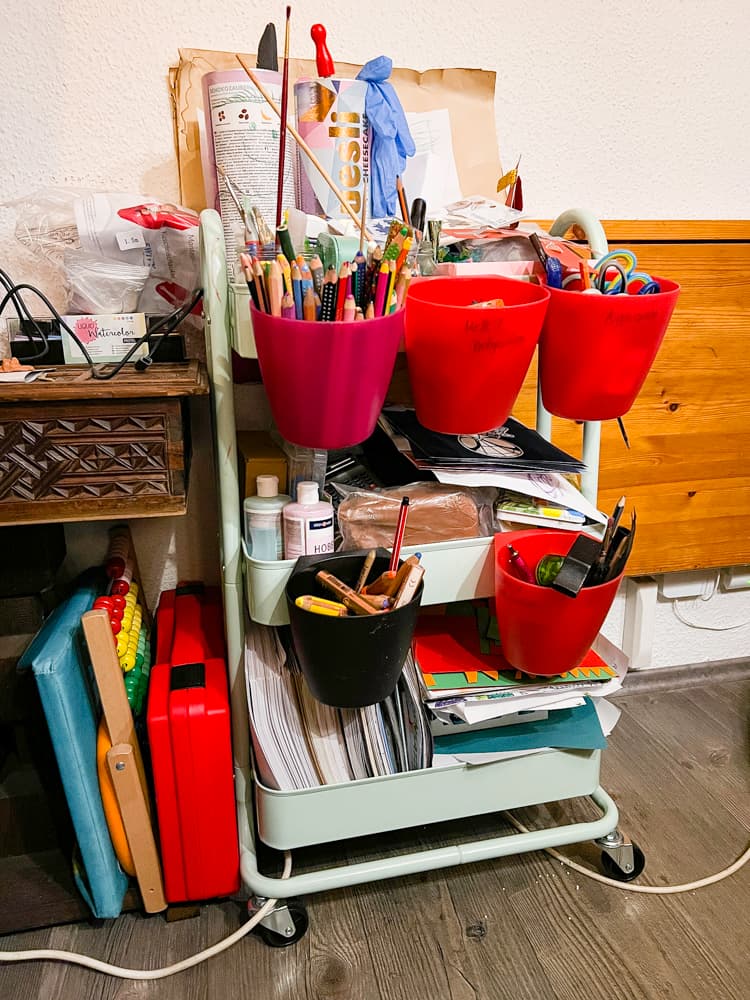 Und auch unser Bastelwagen für die Kinder sieht eher chaotisch aus, obwohl ich ihn wirklich sehr regelmäßig aufräume.