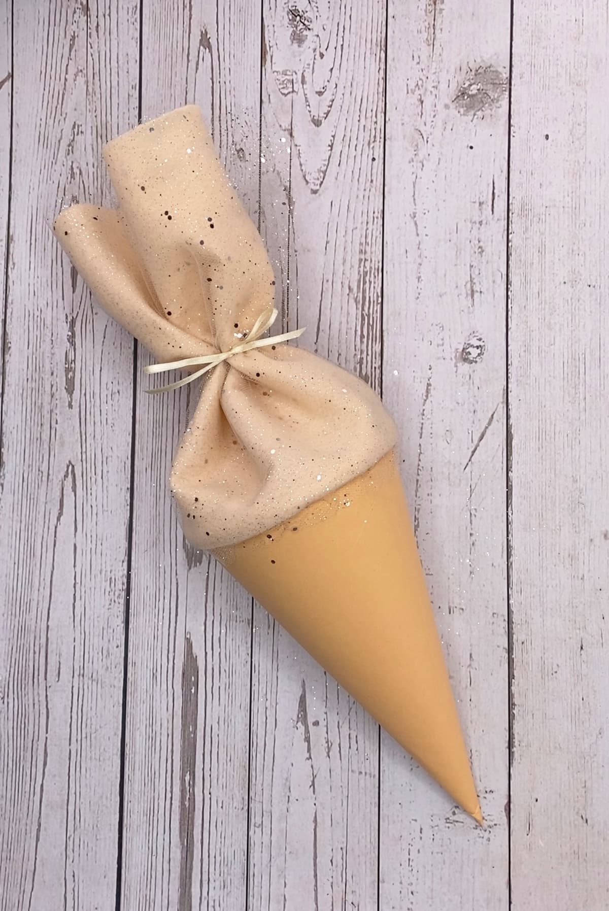 Die Schultüte, die du mithilfe unserer Vorlage basteln kannst, ist etwa 28 cm lang und hat oben einen Durchmesser von ca. 14 cm.