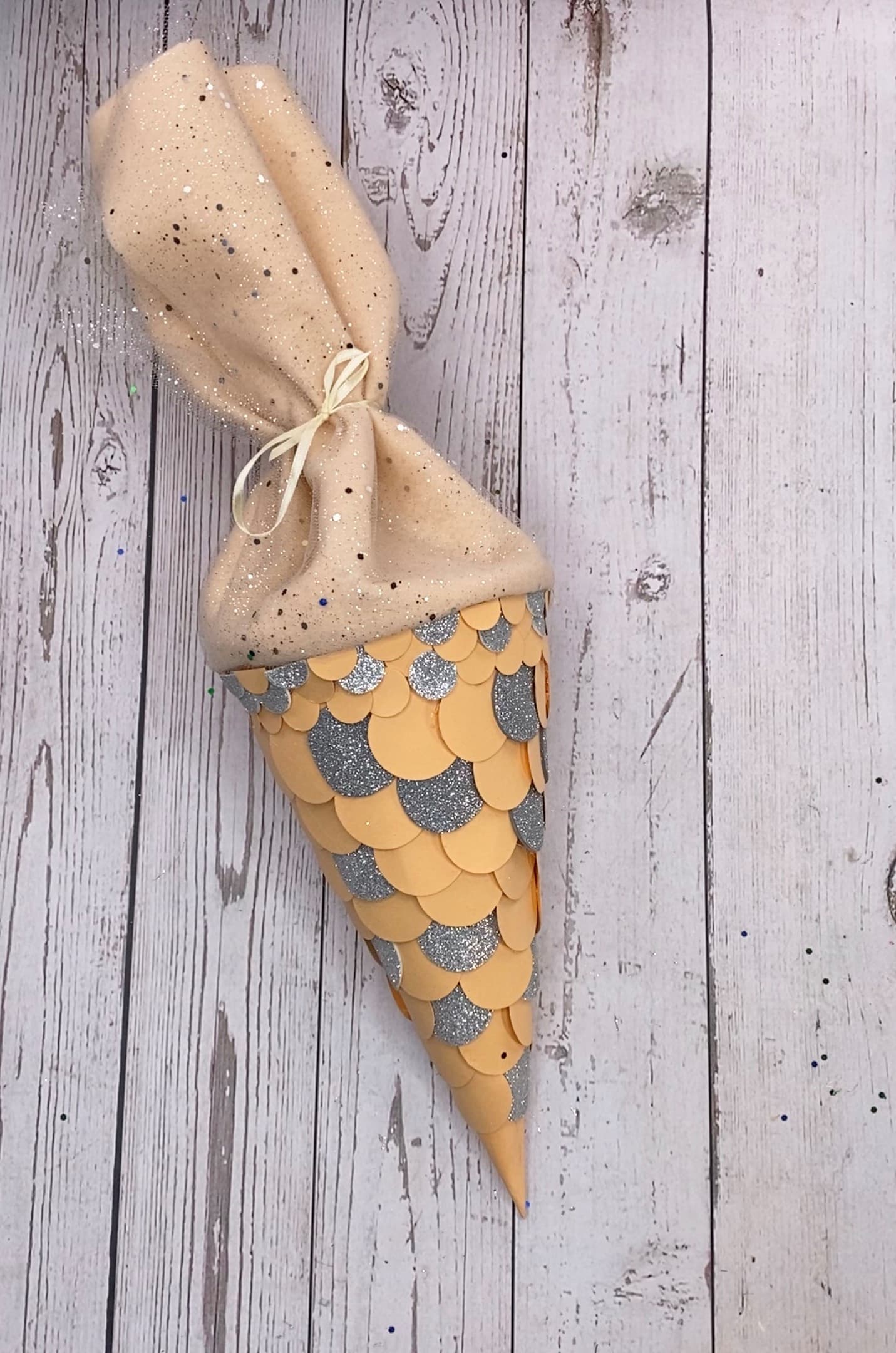 6. Jetzt ist die fummelige Arbeit getan und der Spaß geht los, es kann dekoriert werden :) Unsere Geschwistertüte ist zu einer Meerjungfrau-Schultüte geworden. Wir haben sie mit glitzernden Moosgummi und einfarbigen Bastelkarton schuppen beklebt. Anschließend haben wir eine aus Moosgummi gebastelte Meerjungfrau darauf geklebt.