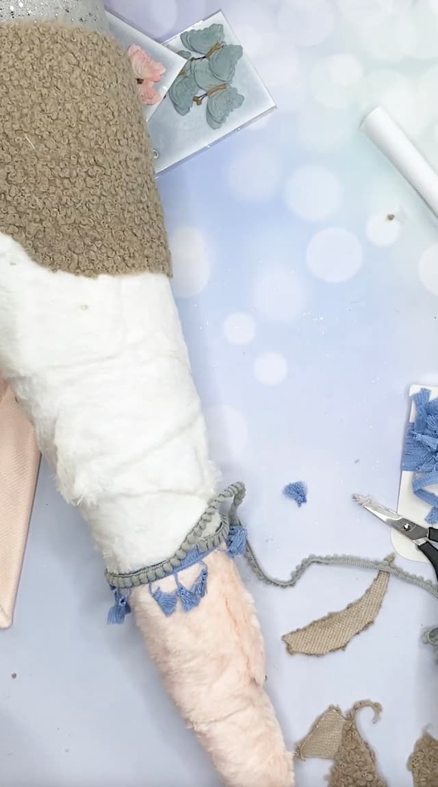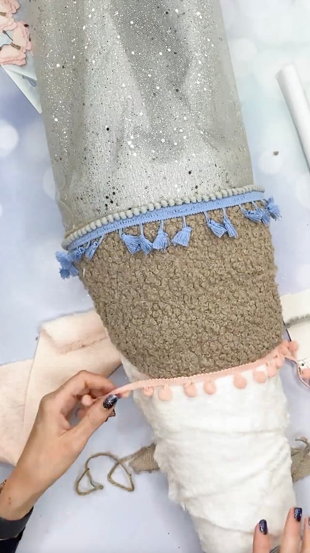 - Dann können bereits die Pompon-Borten angebracht werden, diese kaschieren die Übergänge der Plüsch-Bänder