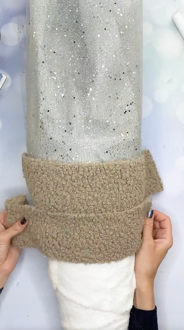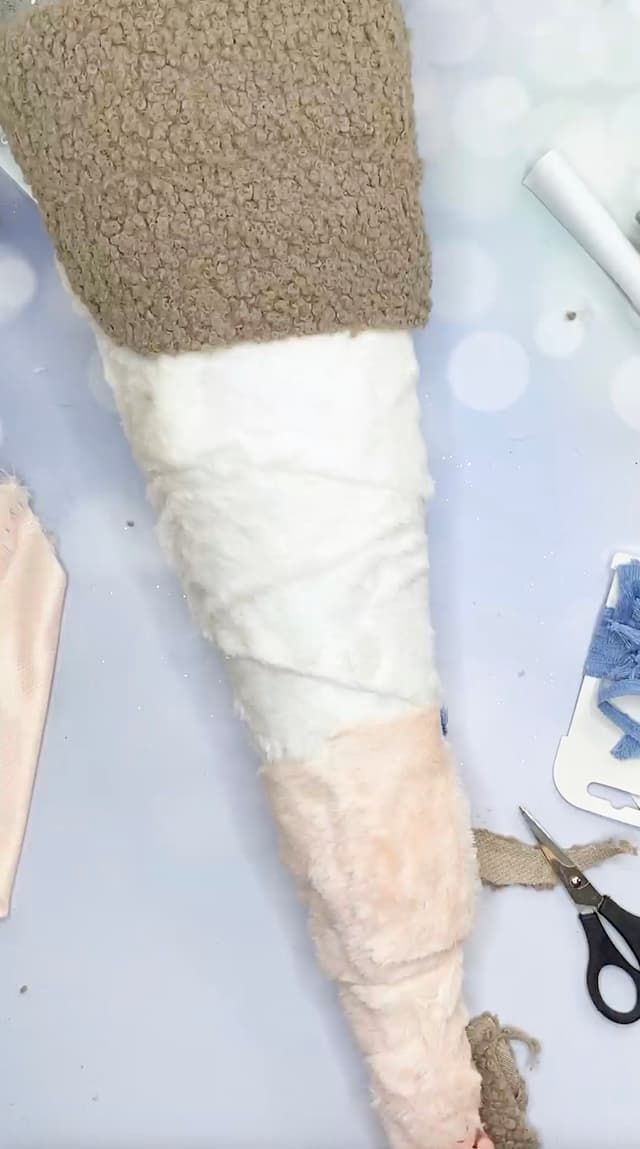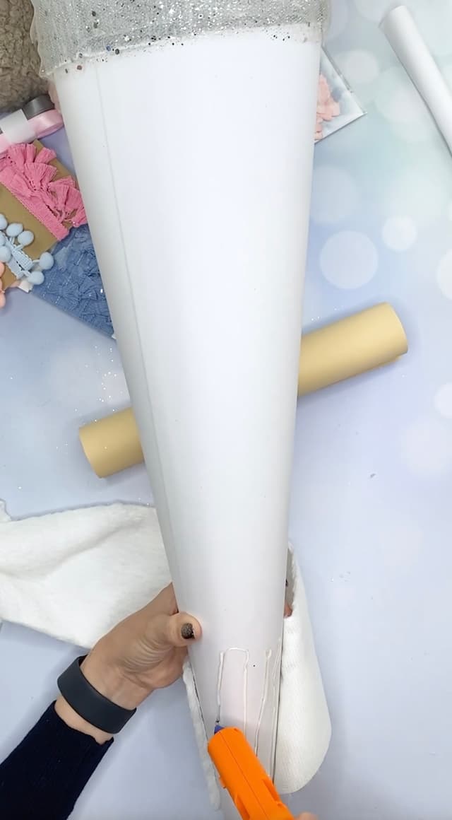 - Den gesamten Schultüten-Rohling beklebst du dann von unten nach oben mit dem Plüschfell-Band in weiß