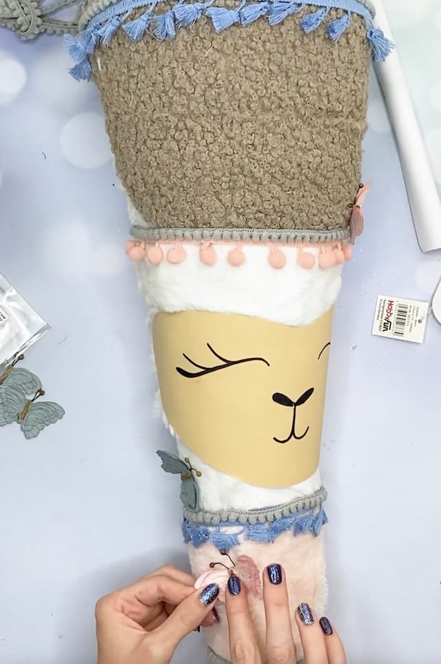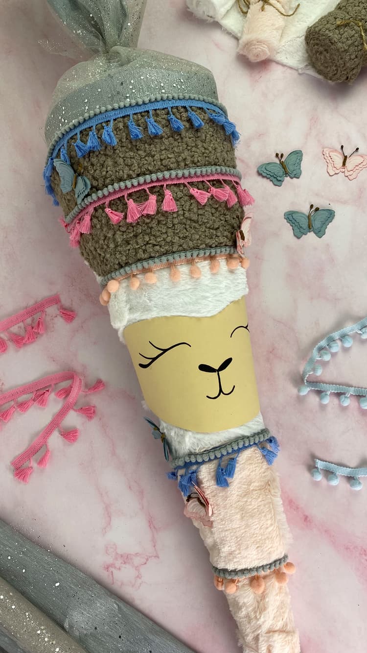 - Zum Schluss ein paar Schmetterlinge auf der Schultüte verteilen und eure Lama-Schultüte ist fertig zum Befüllen