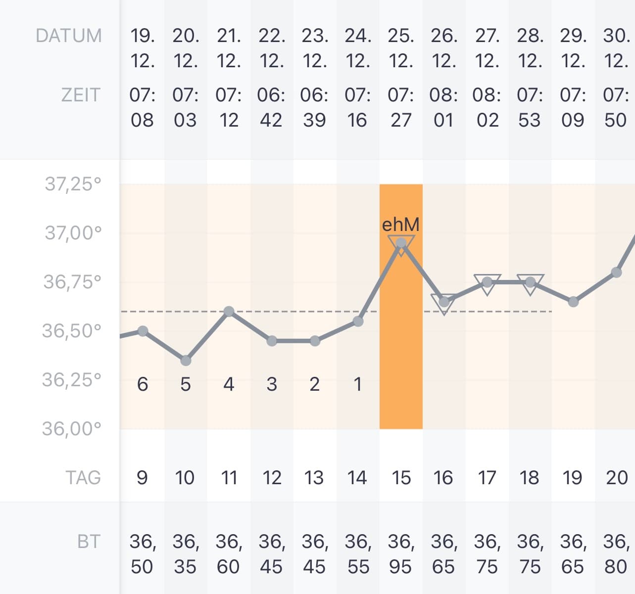 Neben der tagesbezogenen Anzeige, kann man sich den Zyklus auch grafisch anzeigen lassen und so den Temperaturverlauf noch besser erfassen. In dieser Anzeige werden zudem die Messwerte mit kleinen Dreiecken markiert, die für die Auswertung ausschlaggebend waren.