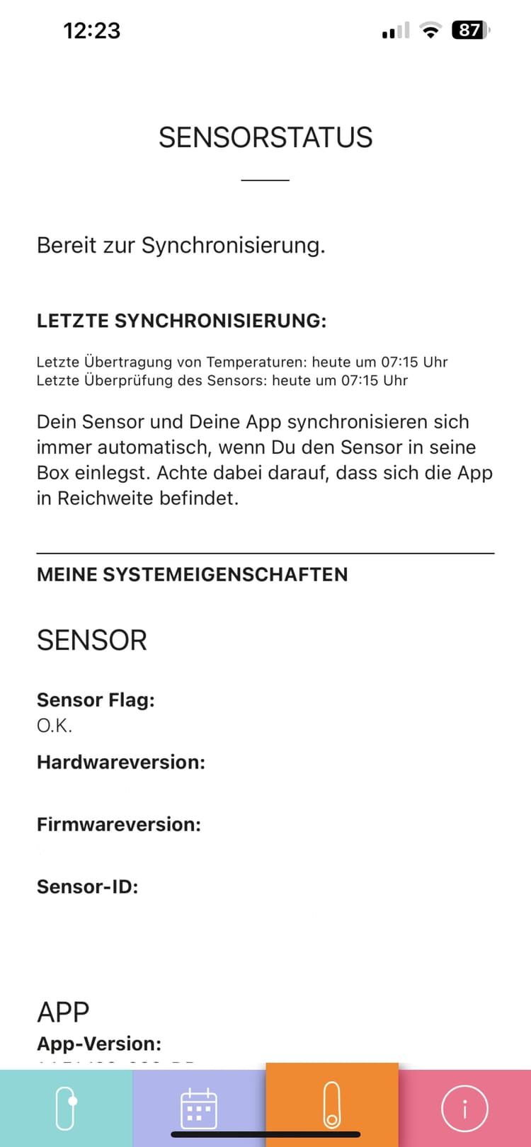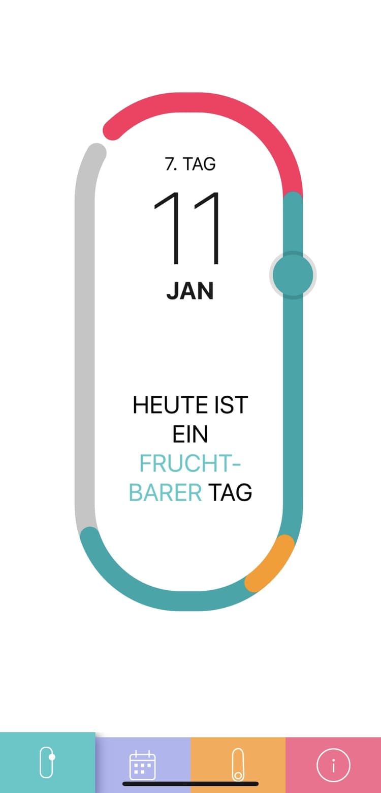 Auf dem ersten Reiter (grün) wird direkt angezeigt, ob man gerade fruchtbar ist oder nicht und an welcher Stelle des Zyklus man sich befindet. Der zweite Reiter (blau) zeigt den aktuellen Zyklus, dritte Reiter (orange) bietet Informationen zum Sensor und zur Synchronisierung und der vierte Reiter (rot) zeigt die Einstellung, FAQs und weitere wichtige Informationen.