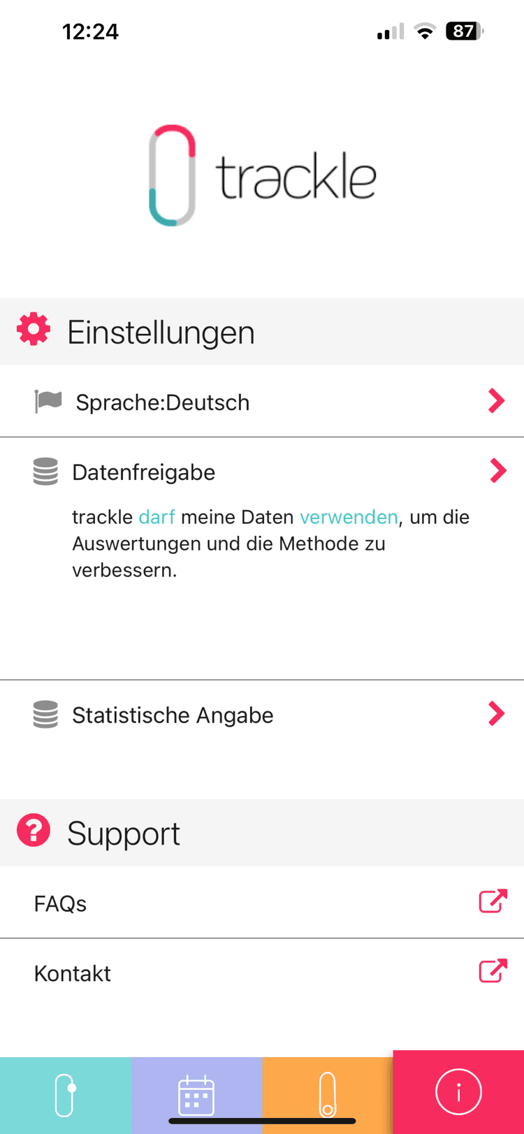 Die Trackle App ist sehr übersichtlich. Es gibt 4 Reiter am unteren Rand des Bildschirms: