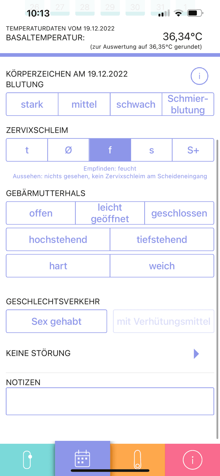 Der zweite Reiter ist meiner Meinung nach der wichtigste: Hier kannst du sehen, welche Temperatur gemessen wurde, in welcher Phase des Zyklus du dich gerade befindest und hier kannst du auch alle relevanten Daten eintragen.